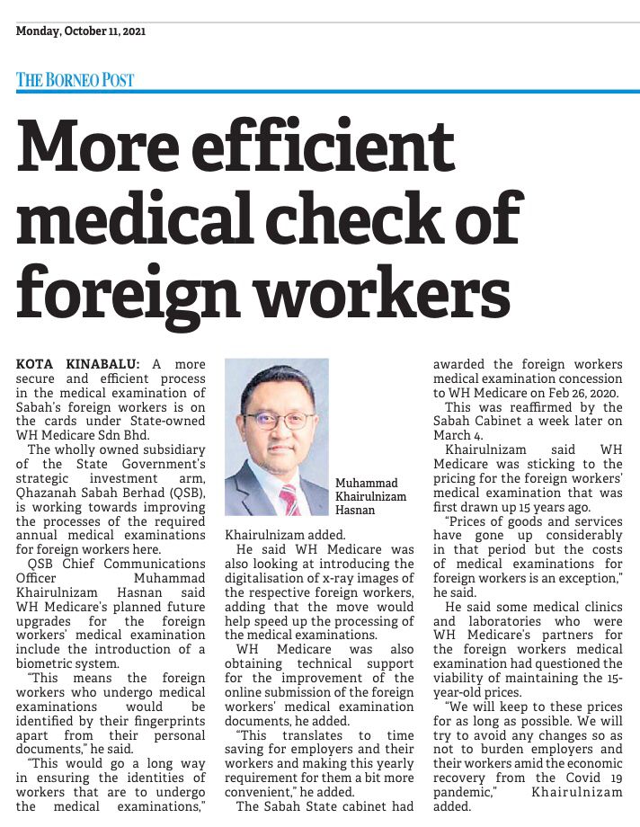The wholly owned subsidiary of the State Government’s strategic investment arm Qhazanah Sabah Berhad (QSB) is working towards improving the processes of the required annual medical examinations for foreign workers here.