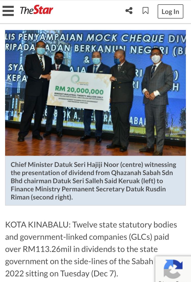 Sabah’s investment arm Qhazanah Sabah Berhad (QSB) has paid the final dividend of RM15 million and additional RM5 million under its Corporate Social Responsibility (CSR) to the State Government.