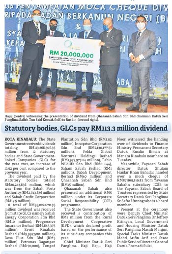During the ceremony, the State Government received dividends totalling RM113, 266, 306.35 million from 12 Statutory Bodies and State Government-linked Companies (GLC) for the year 2021, an increase of 12.92 per cent compared to the previous year.