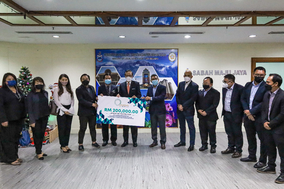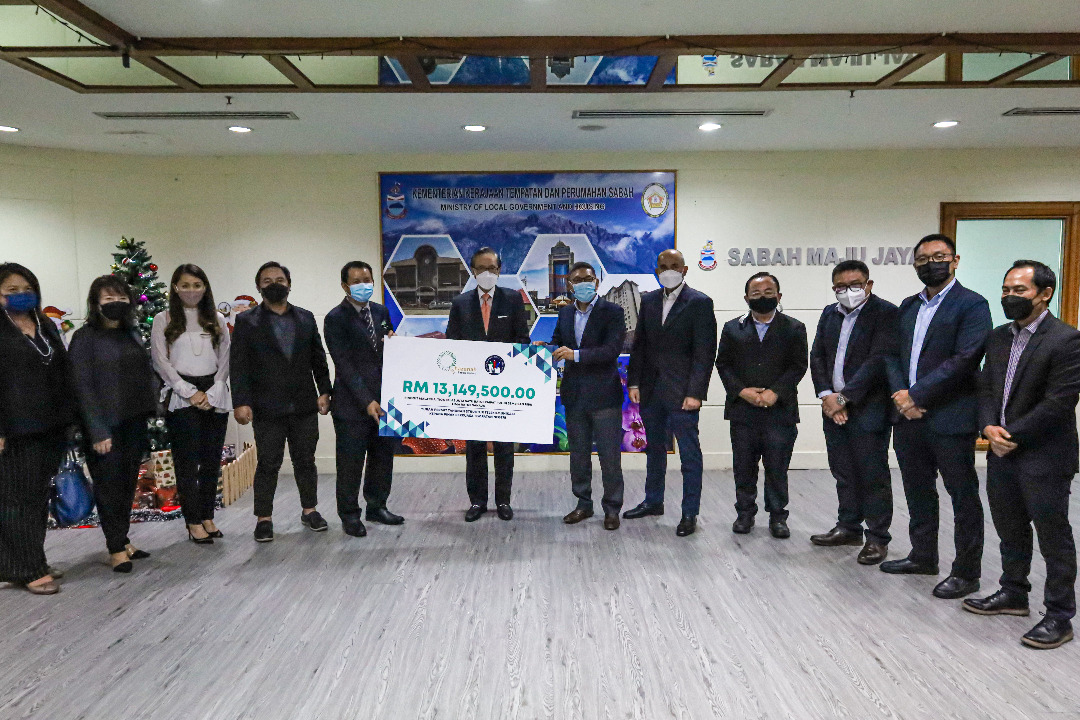 Qhazanah Sabah Berhad (QSB) Executive Director Tuan Haji Mohd Shukor Abdul Mumin handed over RM13.1 million worth of annual permit fee on telecommunication structure and RM200,000.00 worth of Corporate Social Responsibility (CSR) for a gravity water project in four villages namely Kampung Waang, Kampung Toboh Baru, Kampung Mohimboyon and Kampung Kiwawoi of Karanaan constituency to State Minister of Local Government and Housing Datuk Seri Panglima Masidi Manjun.