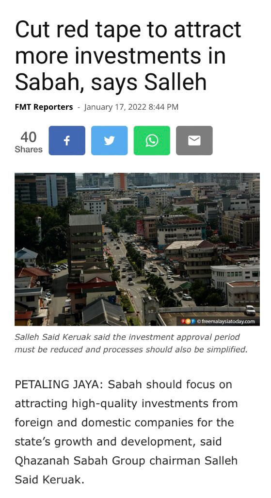 Qhazanah Sabah Berhad (QSB) Chairman, Datuk Seri Panglima Dr. Salleh Said Keruak believes that Sabah must focus on attracting high-quality foreign and domestic investment by materialising various investment strategies and policy initiatives amid the Covid-19 pandemic.