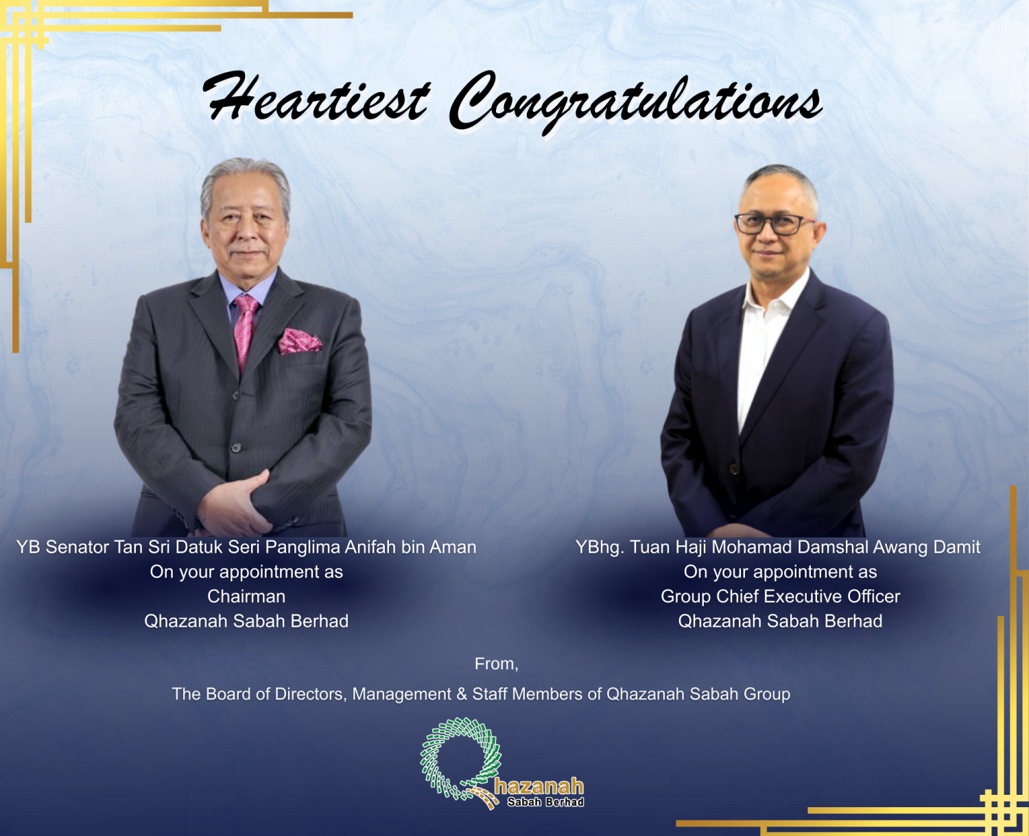 Qhazanah Sabah Berhad (“QSB”) today announced the appointment of YB Senator Tan Sri Datuk Seri Panglima Anifah bin Aman as its Chairman, effective 12 January 2026, and Encik Mohamad Damshal Awang Damit as its Group Chief Executive Officer (GCEO), effective 2 February 2026.