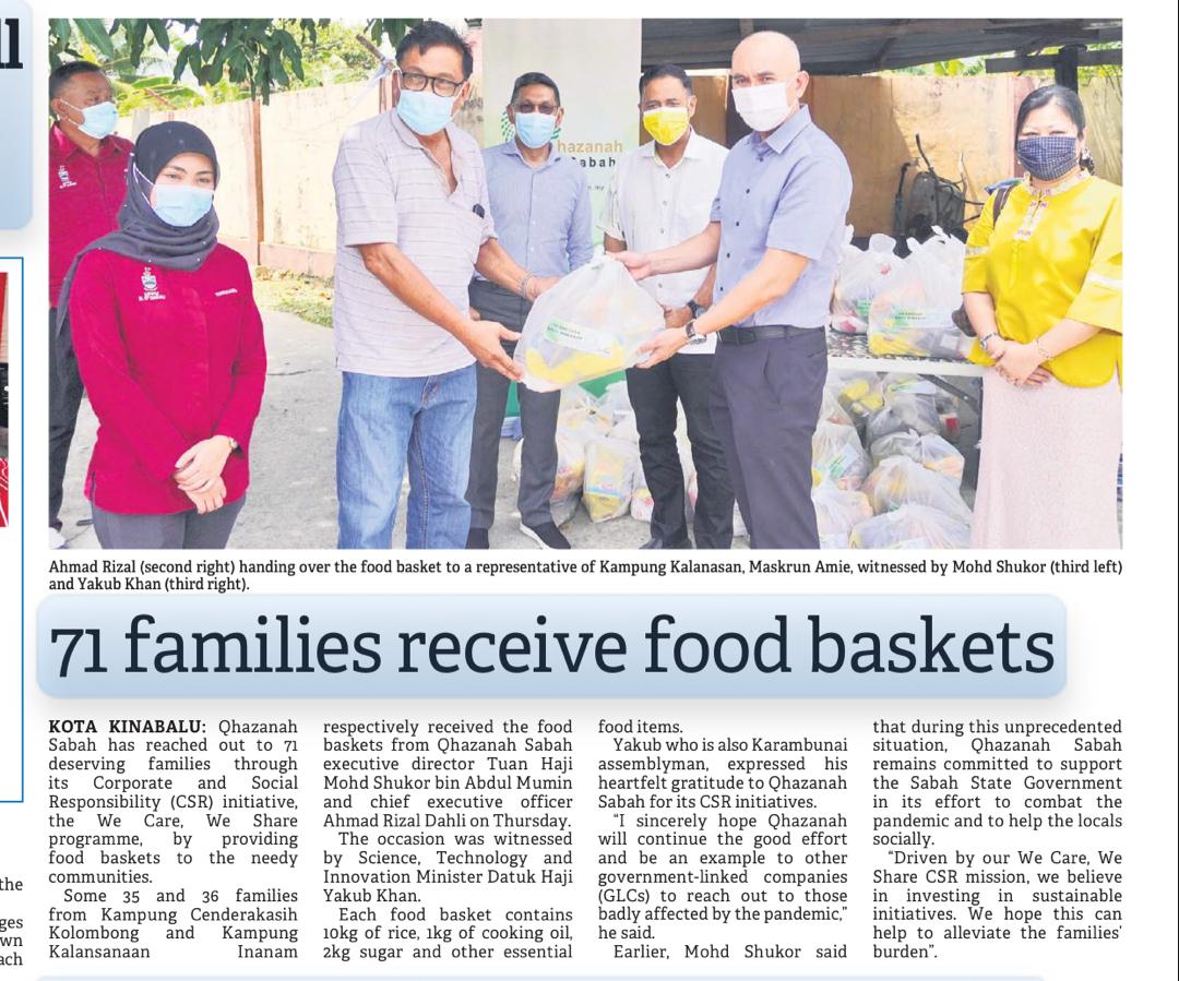 Some 35 and 36 families from Kampung Cenderakasih Kolombong and Kampung Kalansanan Inanam, respectively, received the food baskets from Qhazanah Sabah’s Executive Director Tuan Haji Mohd Shukor bin Abdul Mumin and Chief Executive Officer Encik Ahmad Rizal Dahli.