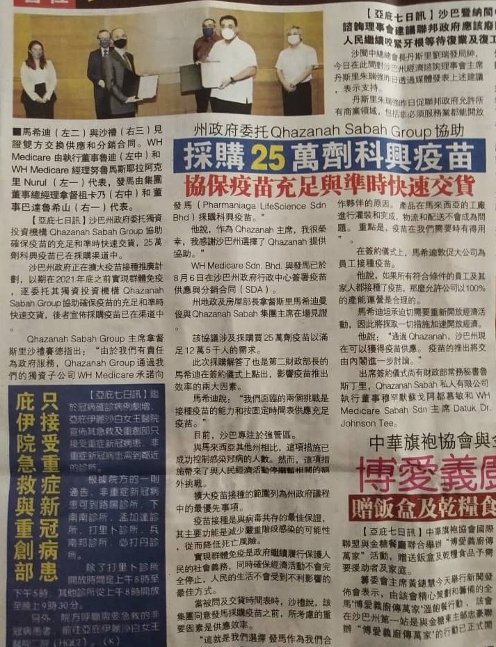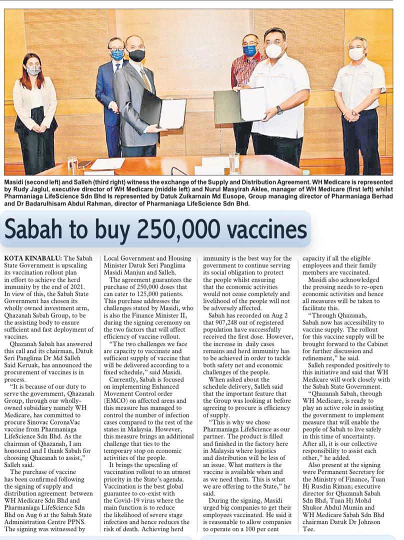 In view of this, the Sabah State Government has chosen its wholly owned investment arm, Qhazanah Sabah Berhad Group, to be the assisting body to ensure sufficient and fast deployment of vaccine.