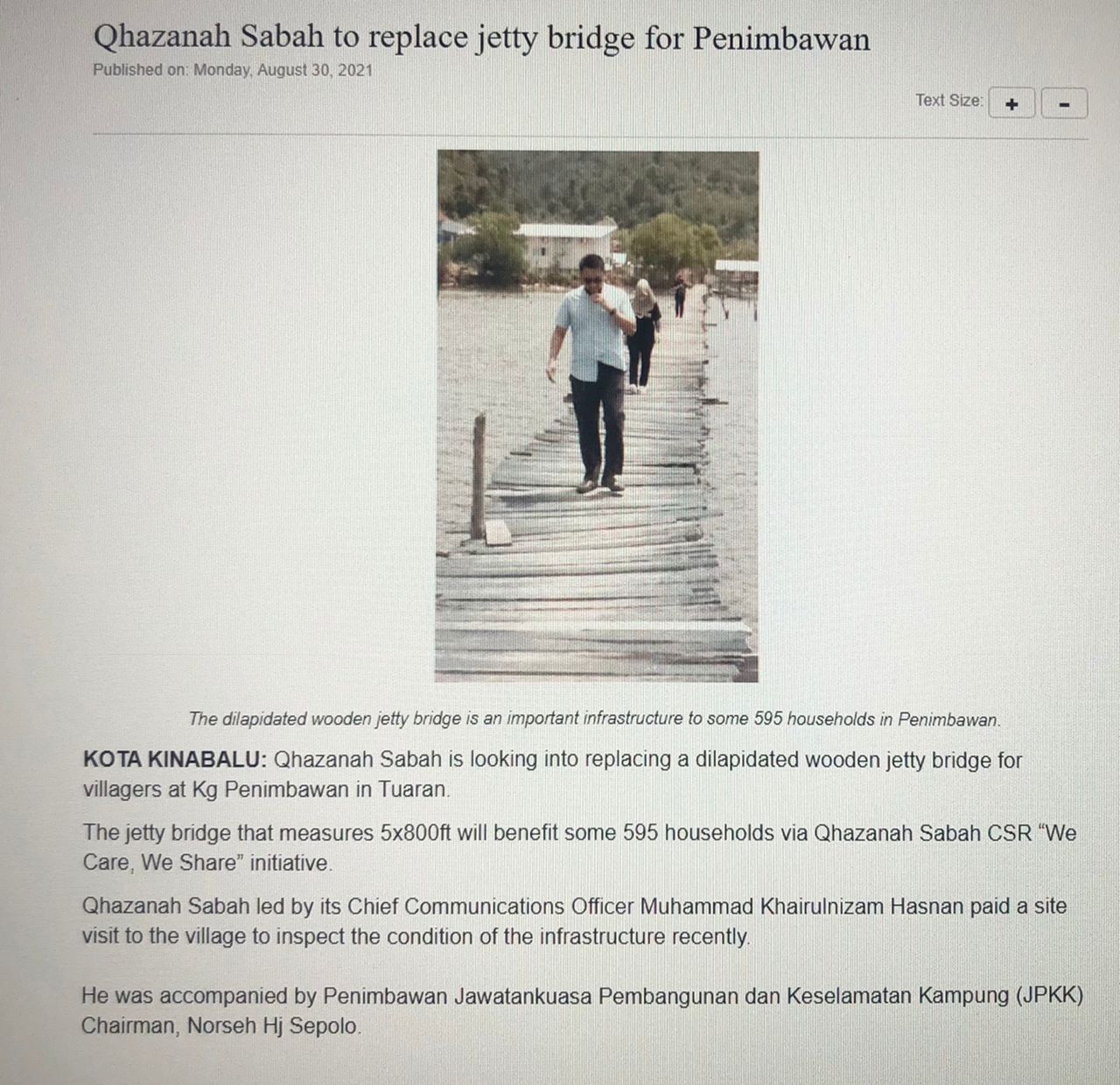 A jetty bridge of 5x800ft will be built for some 595 households in Kampung Penimbawan Tuaran through Qhazanah Sabah Berhad Corporate Social Responsibility (CSR) “We Care, We Share” Project initiative.